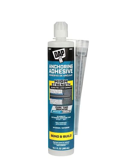 DAP High Strength Anchoring Adhesive has a 10,000 lb load capacity for anchoring medium to high load projects. Self mixing, low odor, styrene free 2-component adhesive. Set bolts, threaded rods for railings, racks, and more. Working time of 15 minutes in room temperatures. It applies blue and cures gray when fully cured.