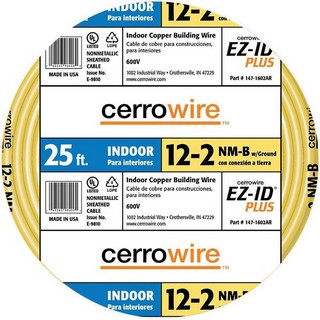 It is a 25-Feet Non-Metallic Sheathed Cable. This wire is designed for use in dry spaces for residential wiring applications. The cable with Ground Copper (Romex Loom) 90 Degree C Cut Lengths. 25-foot solid 12-Gauge UL listed indoor copper building wire. 2 conductors with ground. Not for use in direct burial applications. Use in both exposed and concealed dry locations, and in air voids of masonry block or tile walls which are not subject to excessive moisture. Yellow 30 mil-thick PVC jacket.