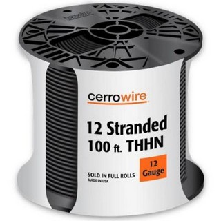 The Cerrowire 100 ft. Black 12-Gauge THHN Cable is rated for 600 Volts and has 20 allowable amp activities. This 12-gauge, single-conductor copper electrical wire is intended for indoor use and comes in 100 ft. lengths on a shrink-wrapped reel. UL listed, CSA listed.