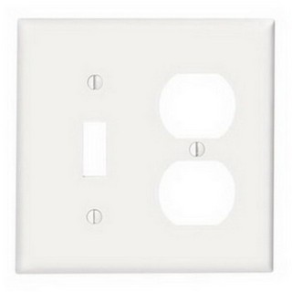 Leviton 86005 ivory 2-gang wallplate. Residential grade, standard size plate with one switch and one duplex receptacle opening.