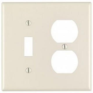 Leviton 86005 ivory 2-gang wallplate. Residential grade, standard size plate with one switch and one duplex receptacle opening.