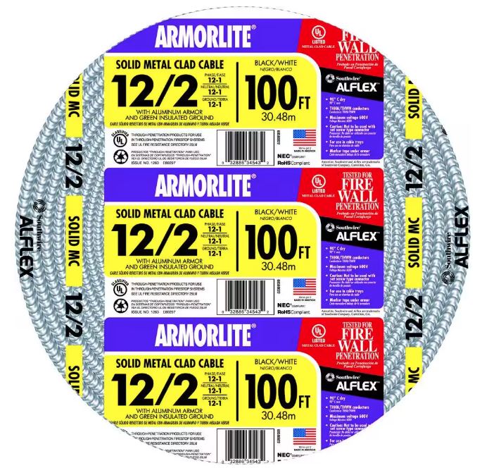 100 ft. 12-2 CU THHN Black/White/Green Metal Clad Armorlite Cable